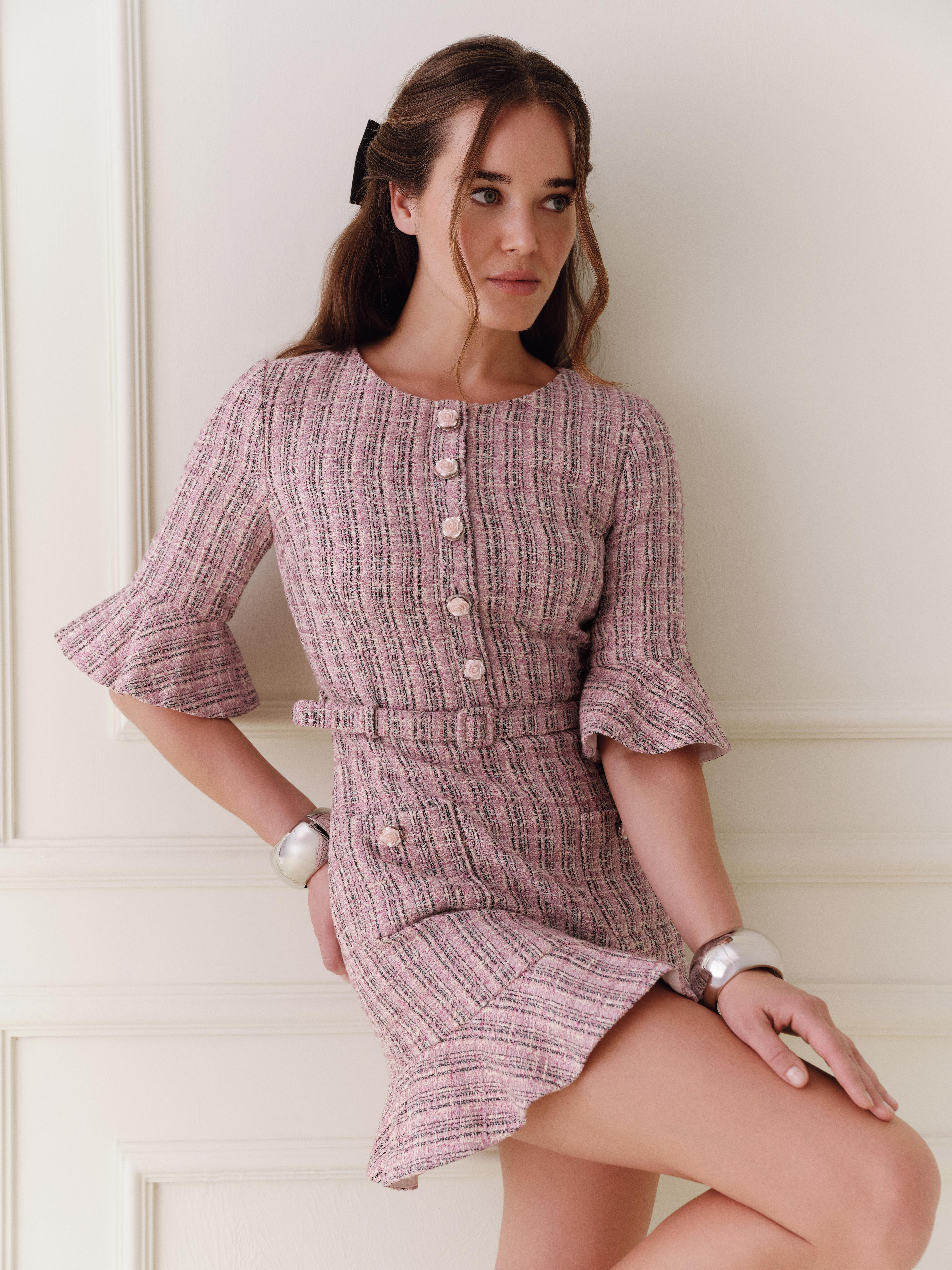 * Gül düğme detaylı, kemerli elbise